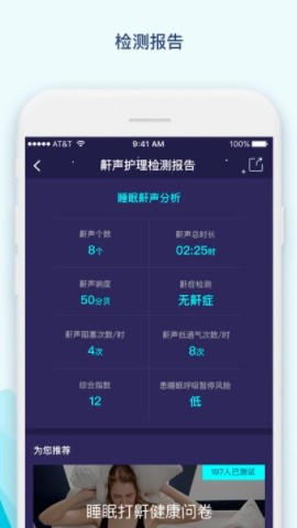 鼾声护理app这里有智能检测报告,能够为许多用户提供更加快速和精准的检测功能与服务,你们都可以获取不同的检测方式,同时对于大家都有较好的健康帮助和辅助,各位完全都可以更加放心的在这里使用,更好为有健康睡眠需要的朋友们提供全面的帮助,感兴趣的话现在就可以来使用这里的检测功能服务,更好的关注自身健康哦。