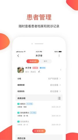 3.及时跟进病患的病情,还可以向患者提供科普知识,打造个人品牌,患者可以随时在线上就诊问诊,随时都可以和医生在线互动,功能十分强大