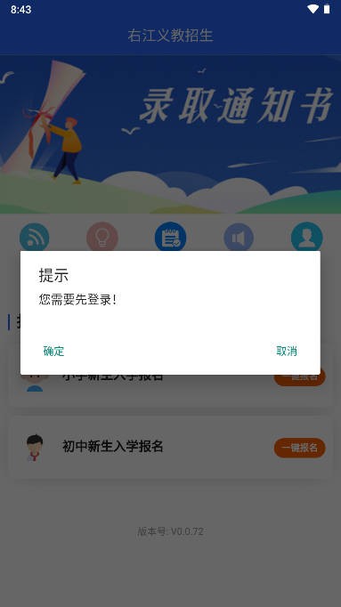 2.在首页点击【初中新生入学报名】-【一键报名】,App提示需要登录