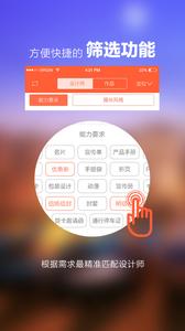 {筛选设计师}有设计需求的用户,可通过对设计师的擅长技能、擅长风格、距离远近、交易数量、评价高低等参数,来编辑筛选找到符合自己需求的设计师,预约提供设计服务;也可通过作品类型、作品颜色、作品行业来筛选出符合自己需求的设计作品模板;