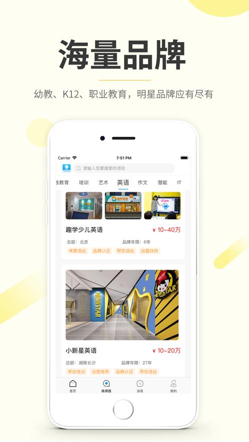 幼儿教育、艺术教育、机器人教育、K12教育,各种热门加盟项目,满足您个性化的投资需求。
