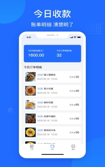 一款餐饮商户在线经营的APP,可查看今日收款总额,并实时查看订单的状态,可赋能商户实现门店的数据化,海量订单详情一目了然,,每天的收款一目了然准时为用户提供餐品,智能化管理的一站式解决方案,帮助商家轻松查看门店的情况以及每天的收益明细。