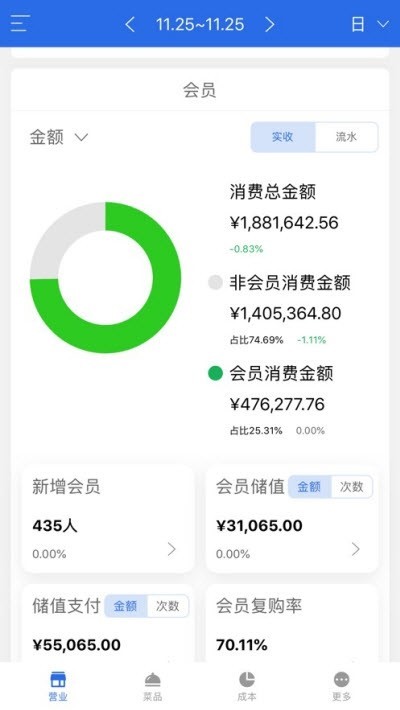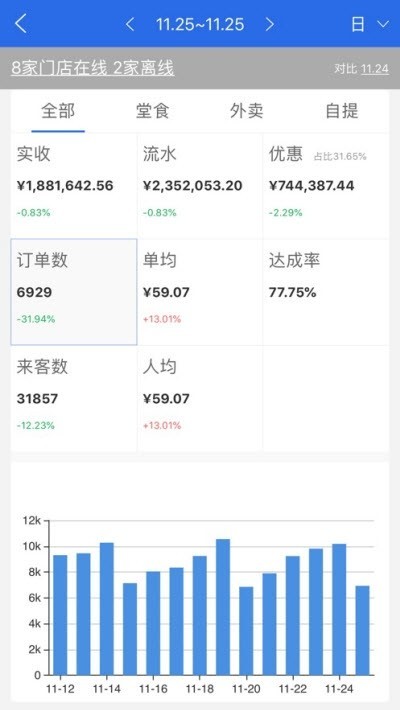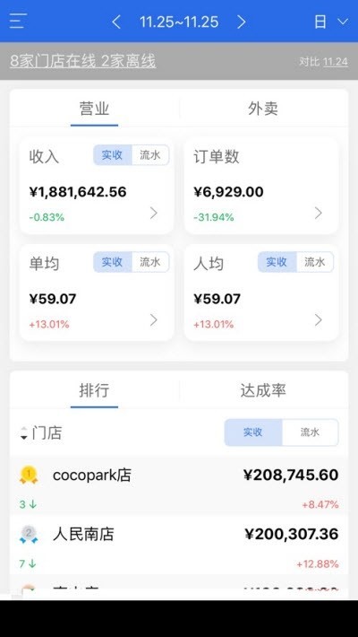 4.可以查看当前的营业情况,外卖情况,达成率等店铺核心数据