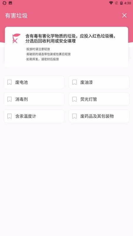 在时间紧迫的时候,可以直接输入关键词,迅速查看该垃圾的种类,帮助用户快速处理生活麻烦,是一款非常贴心的软件。除了了解垃圾的分类之外,系统还为用户提供了垃圾投放的要求提示,帮助用户正确扔掉垃圾,保护生活环境,还有更多扔垃圾的小诀窍等您学习。喜欢这款应用的朋友,快来和我一起下载进行学习吧。