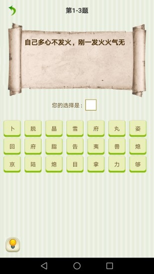 2、用户可以从第一级挑战猜词谜题,只需根据谜题表面的提示选择正确的汉字即可。