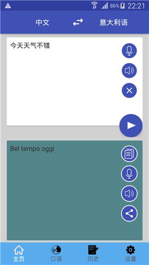 中意翻译app是一款支持中文和意大利语文本翻译的掌上翻译软件,适用在线翻译,适用生活起居、度假旅游会话这些场所,用户可以在这里进行中文和意大利语的翻译,可以提升自己的意大利语和中文水平,而且翻译完成后还有语音可以进行播放,所有翻译的句子也都会被记录,这样下次就更容易进行查找了,而且用户还可以在这里进行口语的学习哦!