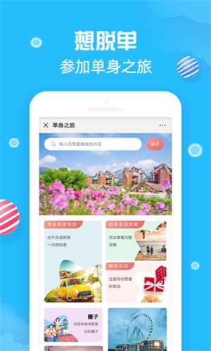 单身之旅app安卓版是专门为单身的朋友们匠心打造的一款提供邂逅爱情旅行服务的手机应用,通过各种联谊和相处活动让你可以接触到更多的异性找到属于自己的爱情,当然即使没有找到自己的另一半我们的活动也可以让你的单身生活变得非常精彩有趣。在这款单身之旅app安卓版中你不仅可以报名参加自己感兴趣的单身集体旅行的活动,也可以给心仪的人购买精美的礼物,方方面面帮助你脱单。