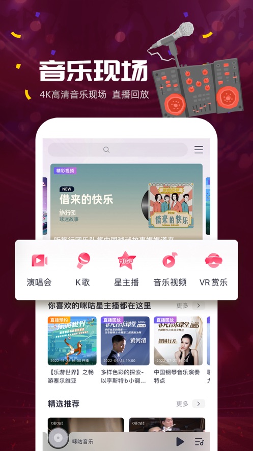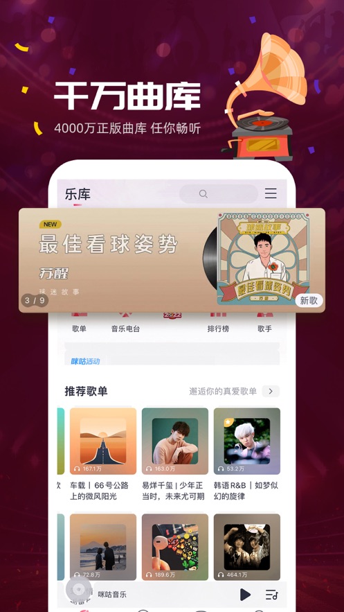咪咕音乐app去广告精简版中有着海量的4000万曲库,让用户可以第一时间的来收听到最新的歌曲,软件还会为用户来推荐热门的歌曲。