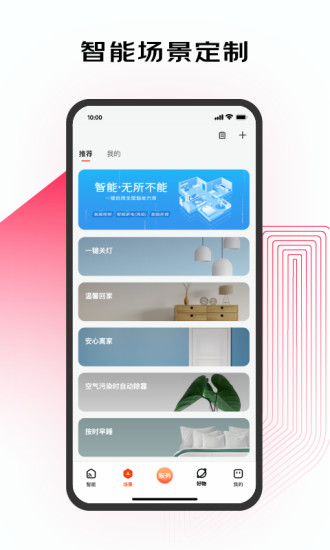 在这个智慧生活的软件中你可以定制不同的场景去布置全部的遥控功能,而且你还可以将不同品牌的设备也添加到这里进行管理,还可以获得延保权益。