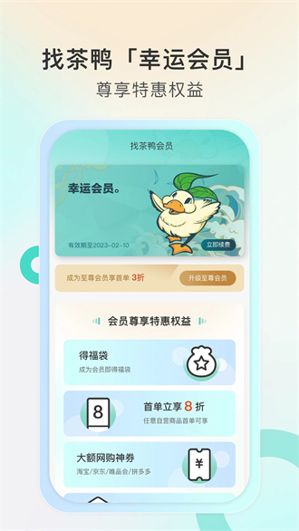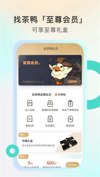 找茶鸭app是一款能够带你发现更多好茶的手机必备应用,在平台上你可以获取品牌的各种茶饮商品,一登录就可以免费成为我们的永久会员,各种特惠权益等你来享受,甚至还会为你累积对应的消费积分,从而免费兑换自己喜欢的礼品。当然在这款找茶鸭app上,用户可以轻松解决很多关于购物和茶饮文化方面的问题,我们将会为你提供24小时在线客服为您服务,为用户打造最完善的线上体验。