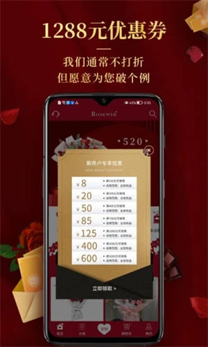 软件新人注册登陆即可领取1288的优惠礼包券,用新人优惠买花更便宜,用户的每个订单也都会有专属客服在一旁进行交流跟进,然后根据用户地点以最近的地区发货送到用户手上。