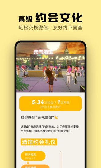 元气酒馆app是时下最受年轻人喜爱的一款网络社交平台,在这里你会遇见来自全世界各地的知音、闺蜜或者心动的人,即使你足不出户也可以通过它探索世界的美好,而且也不会感觉到孤单,因为在任何的时候都会有人陪伴着你。在这款元气酒馆app中每天晚上十点还有各种主题的交友派对都可以加入,还可以进行实时的在线约会,全新的约会场景就好像都在彼此的身边一起做有趣的事情。