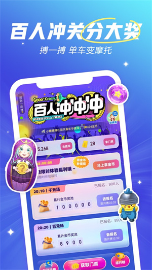 欢游app免费版中还有着“百人冲冲冲”多人闯关玩法,用户可以约上好友来进行闯关,发挥你的聪明头脑来进行游戏通过,通过后还可以和其他用户来瓜分大奖。