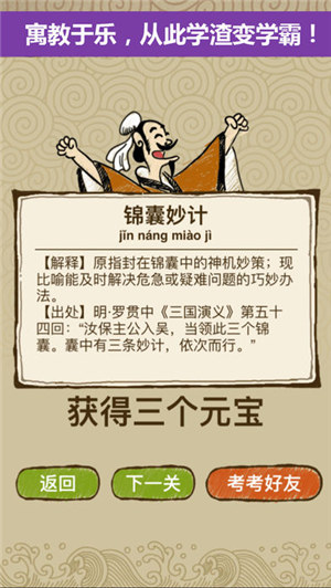 有趣的画风内容,结合各种成语小知识,给玩家带来了很多的乐趣体验,这款游戏玩法简单,很轻松就可以入手,给你带来不少的挑战,快来试试吧。
