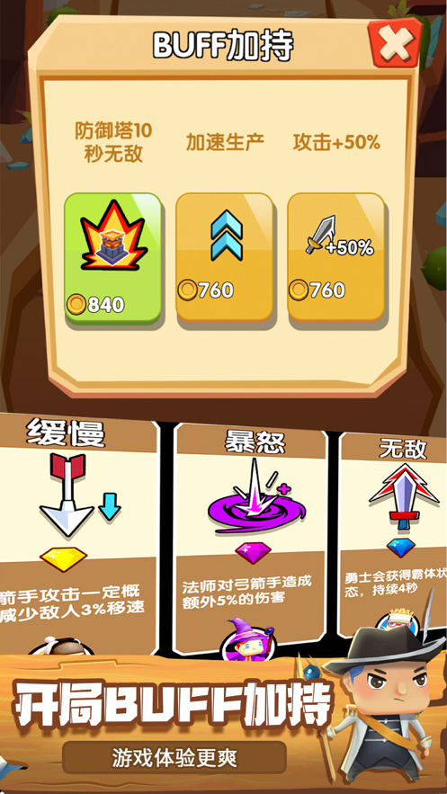 这个游戏采用的是非常魔性奇葩的卡通风格来绘制的游戏画面,游戏中一共拥有四种不同的英雄,最好在你的军团里面矿工、勇士、弓箭手和魔法师都要有。