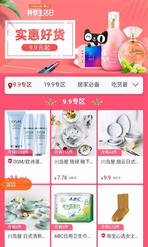 3、平台还不断为用户带来各种各样的特卖活动,九块九专区、19.9专区、居家必备、吃货必买、限时秒杀等福利不停