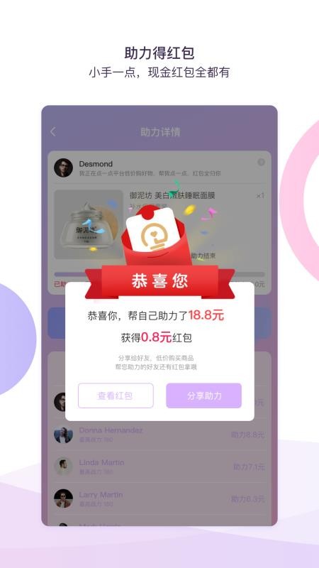 每日登录都能领红包,应用大红包能够抵扣产品价格;可以邀请人给自己助力,助力的人越大多能获得的大红包越大;随时随地开启手机软件就能购买商品,自身需要的、喜爱的商品能够立即获得;一站就能处理所有人的购物要求,不用为了别的商品而东寻西找。