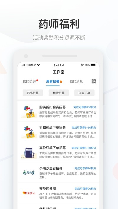 平台推出多种患者招募活动,包括但不限于药企福利项目、平台福利项目和问卷调查活动,活动奖励积分源源不断;