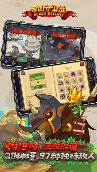 帝国守卫战是一款由塔防游戏爱好者为真爱粉打造的动作塔防。故事发生在阿特拉世界,由兽人,哥布林,胡狼族,巫师等105种怪物组成的敌军控制了傲落王国、峡湾圣地等多个领地。运筹防御塔和能量物品,招募拥有神秘力量的英雄,定制你的极致策略,帮助手无寸铁的村民,推翻恶魔的统治,恢复阿特拉世界的秩序,完成你的使命!