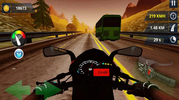 驾驶着你的摩托车,走过每一缕夕阳!《高贵摩托骑手》是一款摩托车竞速类的游戏。高贵摩托骑手游戏的3D画面,给你最真实的驾驶游戏体验!游戏的玩法很简答,你只需要控制你的摩托车,躲避来往的车辆,注意你的摩托车表盘,它代表着你的车辆状态!通过后视镜可以知道后方来往的车辆。你可以自由改装自己的摩托车,打造一辆高性能的摩托车吧!