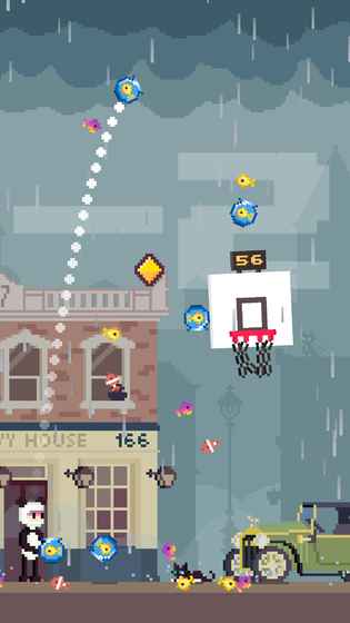 游戏的操作非常简单,玩家们用手指按住屏幕,在我们主角的上方就会出现一条白色虚线,这就是篮球投出去的运动轨迹,我们手指在屏幕上自由移动,就能控制这条虚线移动,包括角度以及力度都可以控制,当我们放开手指的时候,篮球就会被顺着虚线投掷出去。