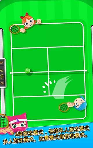 《砰砰网球》,一款非常好玩的网球运动游戏。游戏规则非常简单,只需要把网球扣过你的对手就可以。游戏共有四种模式。你可以选择单人模式自己作战,也可以选择双人模式和别人一起作战,还有比赛模式和街机模式,等你来挑战。