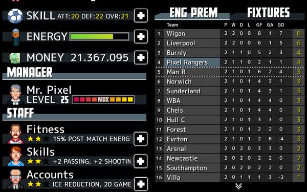《全能足球(Tiki Taka Soccer)》最大的特色就是,他就是一个实实在在的像素足球游戏,这跟之前足球题材的休闲游戏是不同的,而且游戏还加入了养成元素,是一个像大型足球游戏靠拢的小像素足球游戏。