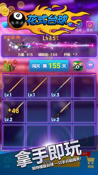这是一款非常好玩的台球游戏,花式台球 单机版内无需连接网络即可轻松在线玩耍,海量关卡等你前来挑战根据要求把相应的数字球打进球袋里完成任务顺利过关,更多精美的球杆等你前来解锁购买,你还在等什么,如果你喜欢这款花式台球 单机版,欢迎前来本站下载。