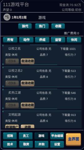游戏平台模拟器游戏破解版是一款手机经营类的游戏,本款游戏里面可以很好的模拟游戏运营赚钱的哦,在里面可以真实的模拟你游戏公司的赚钱的手法的哦,非常的好玩感兴趣的朋友快来本站下载吧。