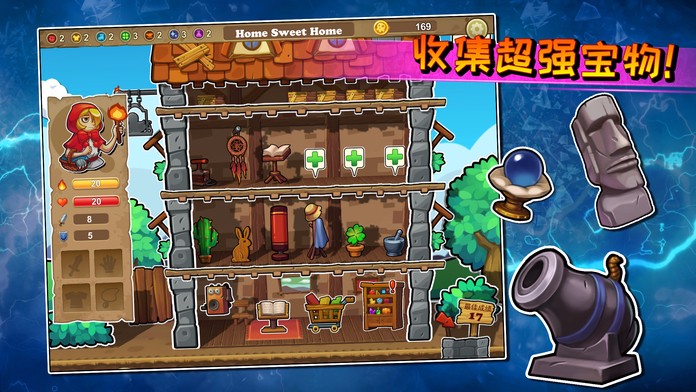 游戏玩法较易上手,玩家需要在寻找钥匙在地牢中闯关,通过踩格子的方法来探索地图,拾取随机掉落的材料可以合成不同的装备和道具,由于背包格子有限,有时候要对物品进行取舍,在走格子的过程中有一些步数限制,战斗采用回合制。探索中获得的碎片可以用来解锁收藏品,摆放在家中即可为人物增加属性点,所得金币可以用来扩充仓库,或者升级装备及道具的星级,也可解锁不同属性的角色。