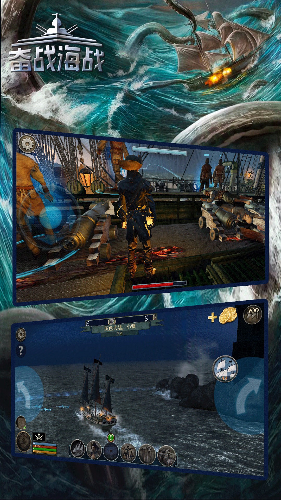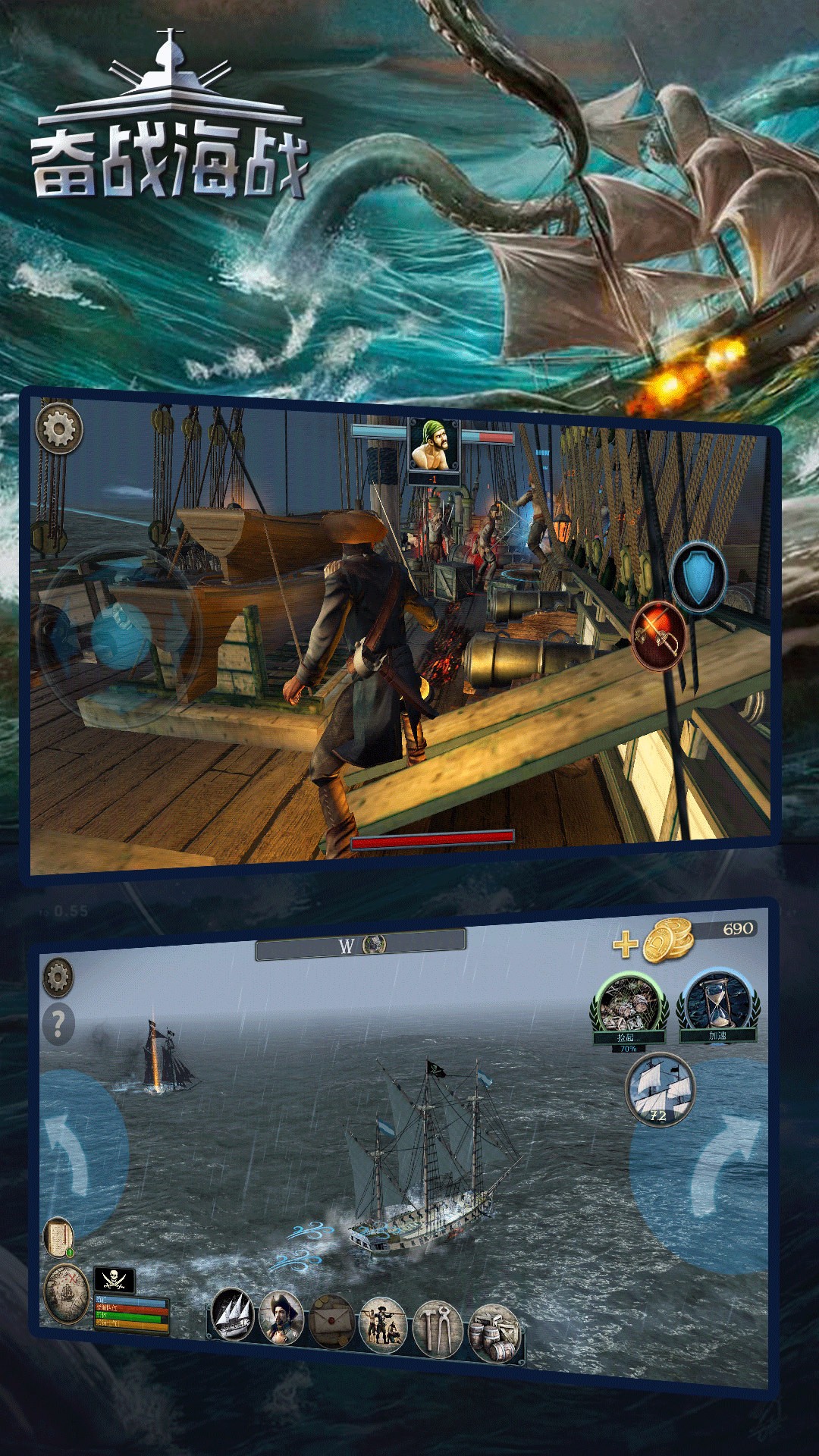 奋战海战,一款海上冒险游戏,游戏中玩家将变身海盗,自定义自己的船只,与敌人作战,并发现游戏世界中的第一块区域。最让人激动人心的部分就是海战,当你经过危险的海域时,你会遇到其他的海盗,并且这还不是最可怕的。最可怕的是深海中还存在着凶恶的神话怪物:北海巨妖、利维坦和其他其他臭名昭著的生物,你要在大海上与他们进行博弈,只有胜利的一方,才能是这片大海的主人。