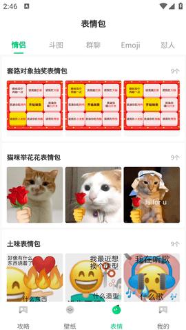 2、在表情包专区之中就能去查看到更多的最新表情包,这里有斗图、情侣、群聊以及emoji。