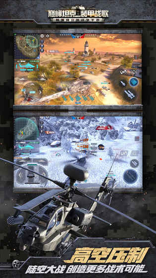 游戏中除了当心来自地面的炮火,还要特别提防头顶上的偷袭!《巅峰坦克》突破传统单一载具对战限制,将陆地作战空间延展至陆空。玩家将驾驶诸如99A、M1A2、梅卡瓦等各国最精尖的主战坦克,与阿帕奇、米-24、武直-10等武装直升机进行陆空激斗。还可以驾驶半人马座、悍马等装甲车进行侦查布雷对空打击。从此不再只有地面战争,选择你喜欢的武器,体验来自陆地与天空的全方位战争竞技感;