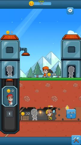 5、当经理头上出现小锤子的图案时,点击小锤子可以对开采的矿工进行加速,不过只有60秒的加速时间。黄色的矿工的箱子里最多可以装1k的金币,电梯的也是,地上推小车的矿工也同样。