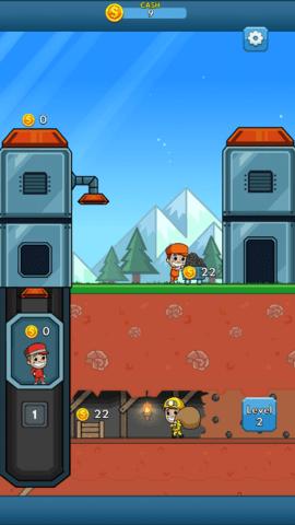 1、首先根据新手指引点击地下矿中的穿黄色衣服的矿工,然后他会进行挖矿,挖好矿后会背到左边靠近电梯的小箱子里面,这时点击在电梯中的红色衣服矿工,他会把箱子里面的东西传送到上方机器里面,然后点击在地面推小车的红衣服矿工,他会推着小车到机器下面接金币,送到原地。这三个矿工的规律性比较强,下面黄色的矿工可以一直进行挖矿,然后电梯里的矿工只需要吧挖好的矿石进行往上运送即可,地面上的工人,在机器下接住矿石推回原地就可以获取金币。