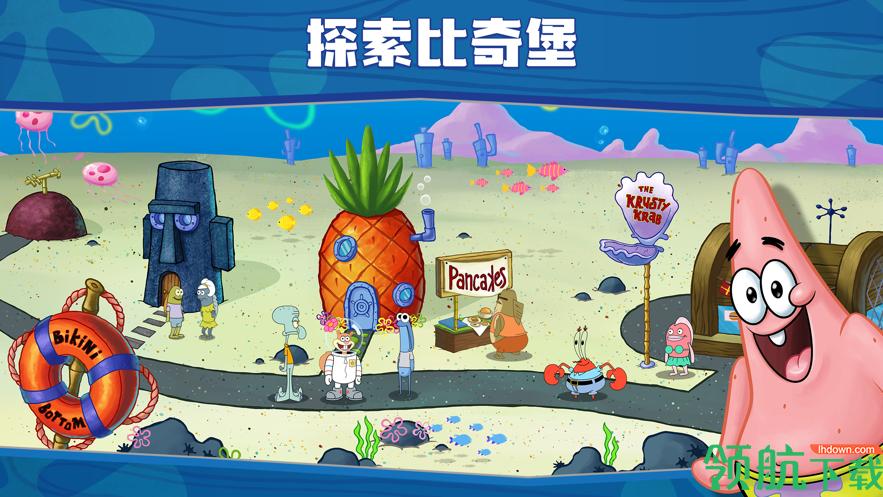 体验海绵宝宝、蟹老板、章鱼哥、珊迪以及派大星带来的全新海绵宝宝独家故事情节。在搞笑的故事情节中进行游戏,解锁新关卡。