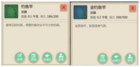 一个鱼竿是一个合格的渔夫的必备品,鱼竿有两种,一种名为普通,一种名为金鱼竿,哪来的呢,都是各种活动的奖励。所以我们还是老老实实的用普通鱼竿吧,仅需1个牛筋和20木头制作,物美价廉。(牛筋当然是杀公牛才有喽,最低的公牛15级)