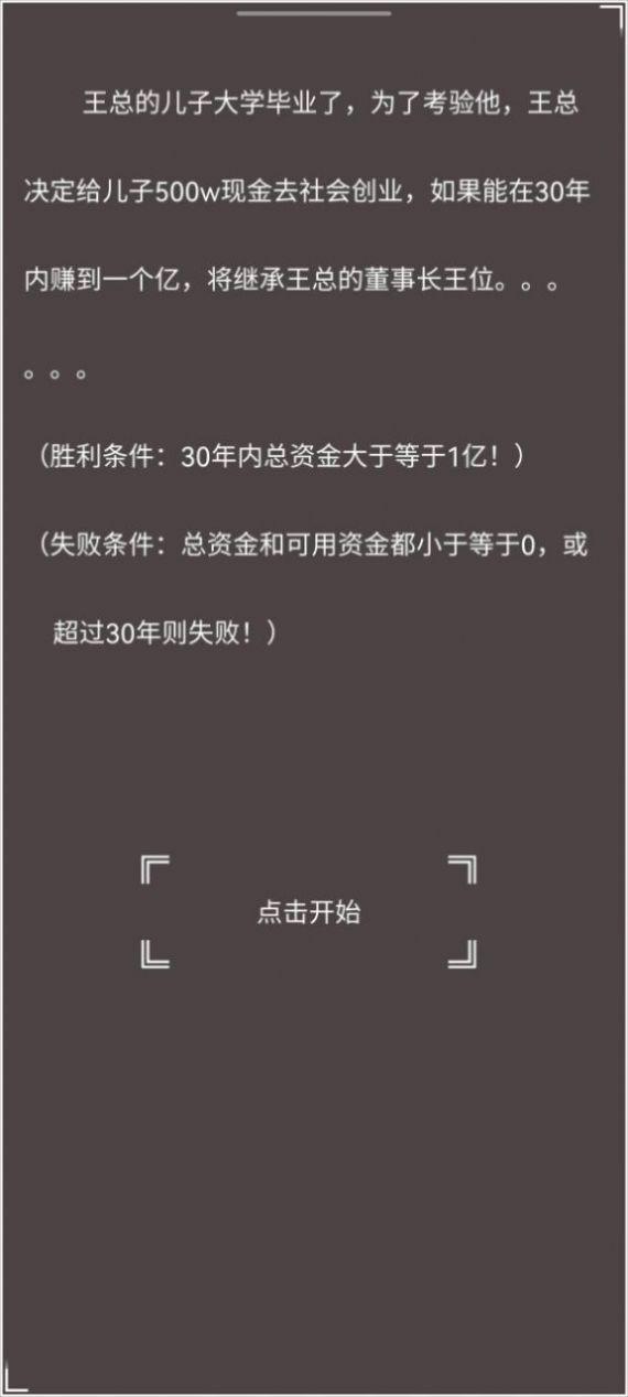 一个小目标就是一个亿,在文字的经营经商游戏里面,玩家思路要更加的清晰,你的一切财富属性都是清晰可见的,你要给自己制定完美的经营计划,想要赚一个亿还是很有难度的,来挑战更多的赚钱方式,玩家可以多次的尝试。