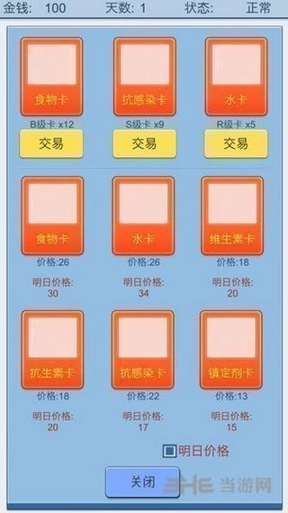 3 买卡会随机,卖卡的价格也会波动,而且有大波动和小波动的叠加,所以情急之下卖卡的卡,注意挑选当前价格比较高的。粮食水和镇定卡的均值大概在30,维生素抗感染和抗生素的价格的平均值大概在20,所以当价格大幅低于均值的时候卖不划算。如果高于均值10,可以适当考虑卖出一些。当然必须是保证能活着的前提下。所以前期是生存,后期是模拟经营做生意。有越多的抽卡次数,就有越大概率抽到ssr。而抽卡次数是由金钱决定的。所以。用足够的粮水保证生存,用金钱和镇定剂发展。用抗生素维生素和抗感染保证突发疾病可以被抵抗。这是大原则。微操微策略方面,就看各人的风险偏好了。