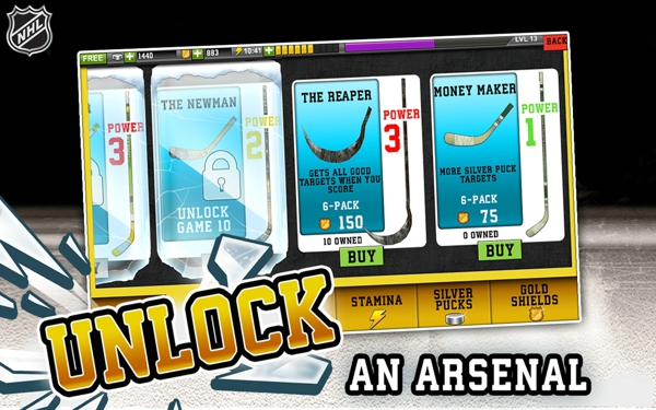 《NHL目标粉碎 NHL Hockey Target Smash》游戏中,你所选择的玩家角色可以选择是30支游戏中球队的任何一支,一路比赛,晋级季后赛,知道赢取斯坦利杯,玩家最后可以得到两套虚拟球衣套装“The Reaper”和“Frost Edge”。