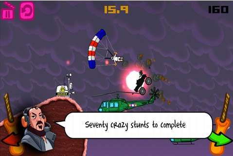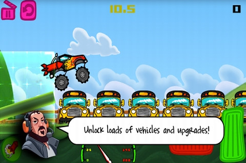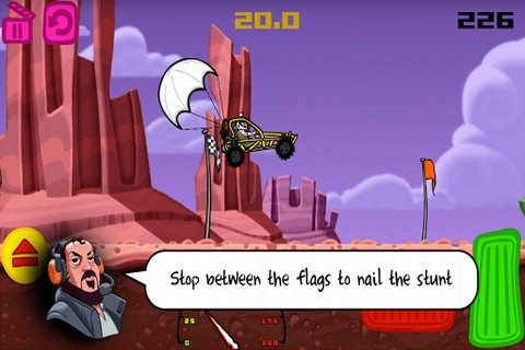 游戏的操作比较简单,难度设计也很合理,玩家需要做的就是控制好绿色油门和红色刹车让车辆做出各种飞跃、翻滚还有各种惊险地形上的特技动作。你要面对的不在是极限运动中那些木块、石头和汽油桶障碍,而是哥斯拉、直升机、巨型卡车、高速运行的火车等等电影画面中才会出现的刺激玩意。除了控制车辆之外,关卡开始的时候也需要玩家在特定位置“架设”好满足高空飞跃的地形,其实就是在绿色的区域画一道斜坡,让你的飞车可以借助坡道成功地滑行出去。