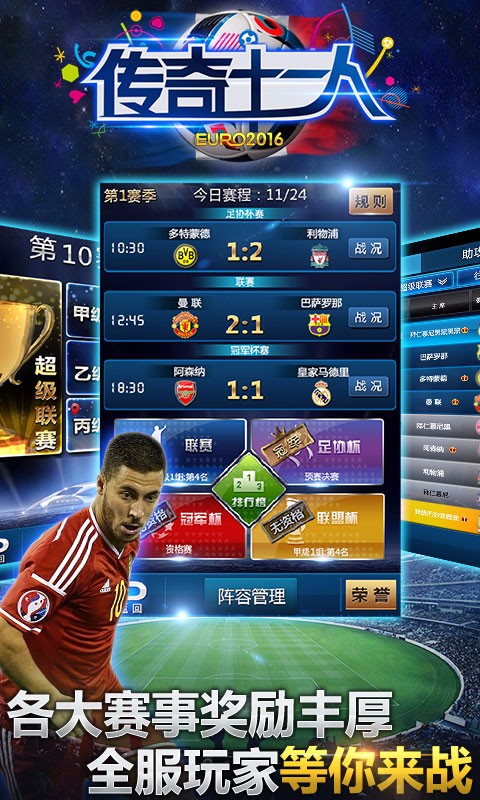 1、超级联赛:带领球队与全球其他玩家一较高下;