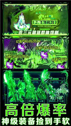 夺宝传说高爆版 全新打造热血传奇,在这款传奇中开启你的冒险 专属神器,激情无限,疯狂PK 极力对决boss,爆率全开各种地图都可以随便进 加入游戏领取豪华礼包: VIP666/VIP777/VIP888 在传奇大世界中开启你的冒险和挑战,在玛法世界....