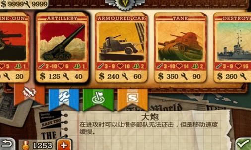 2、坦克移动较特殊,当攻击能消灭敌方部队时,不消耗移动步数。在守城或对垒时,可先用其他兵损耗敌方兵力,坦克完成最后一击,这样坦克可以做到多次攻击,发挥最大攻击能力。另外高级坦克是可以跟战列舰叫板的。面对敌方战列舰时可以用高级坦克配合要塞炮进行打击。
