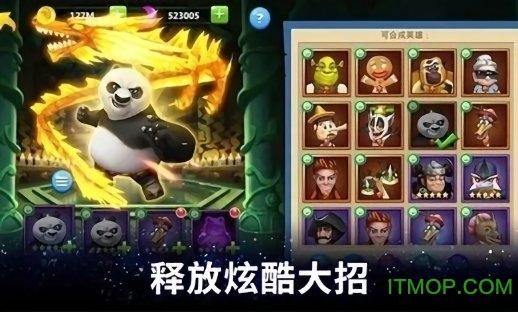 发现, 开启, 收集, 及订制超过100个梦工场动画电影角色包括阿波, 史瑞克, 小嗝嗝, 一妹, 驴子, 涡轮, 皮巴弟先生, 与更多- 每个角色都有他们自己独特可升级的特殊技能大招。装备珍稀配备和传奇物品,可一路帮助你走向胜利!