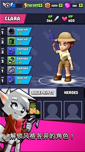 1、丰富多样的角色类型可以解锁,每一个角色都有着独特的战斗属性和外观造型,你可以自由体验;