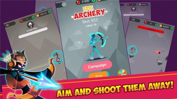 游戏轻松的操作和简单的挑战模式使得玩家随时随地都能够上手操作,火柴人史诗弓箭手中还拥有多个不同的角色和武器,你要通过点击屏幕在游戏中拉动自己的弓箭,除此之外还要证明自己是有史以来最强大的弓箭手。