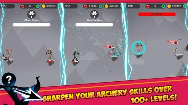 火柴人上部是最脆弱的部位,击中火柴人上部会一击击败敌人,头盔可以保护火柴人上部,击杀敌人来获得金币,升级弓箭和防御塔使其变得更为强大补充箭矢保证充足的弹药。