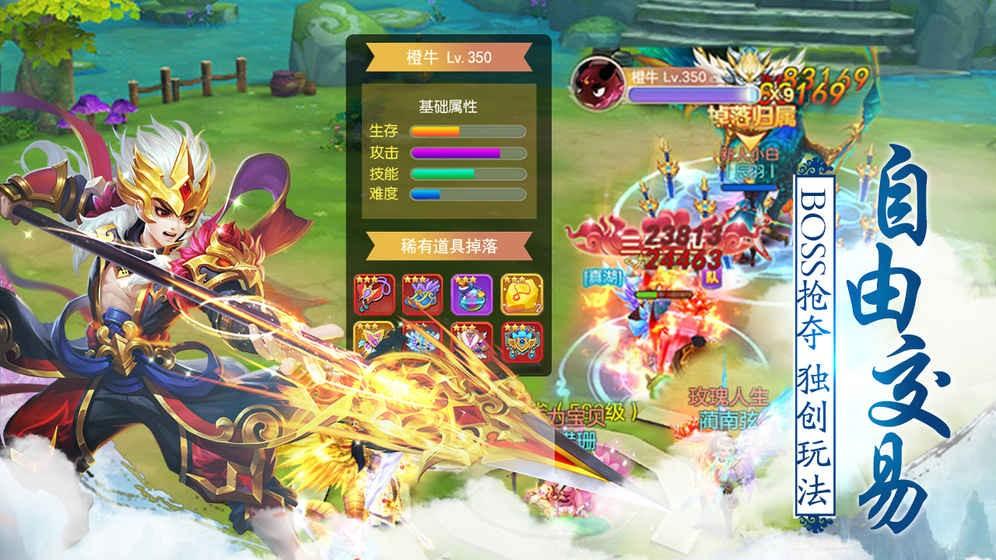 武器幻形酷炫特效 可爱萌宠—幻化进阶伴你同行 独创玩法—BOSS抢夺自由交易 自由交易—交易拍卖,勤劳致富 轻松交友—与爱结缘游历仙境。