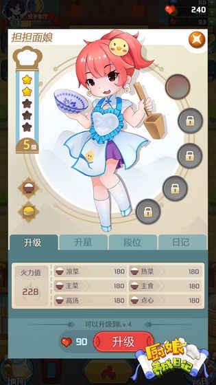游戏中的厨娘也是一大核心玩法,厨娘可以进行培养,她有着各项属性值的设定,如:凉菜、主菜、点心等,同时可能还有其他增幅属性挂饰内容,所以好好培养这些美腻的小助手们